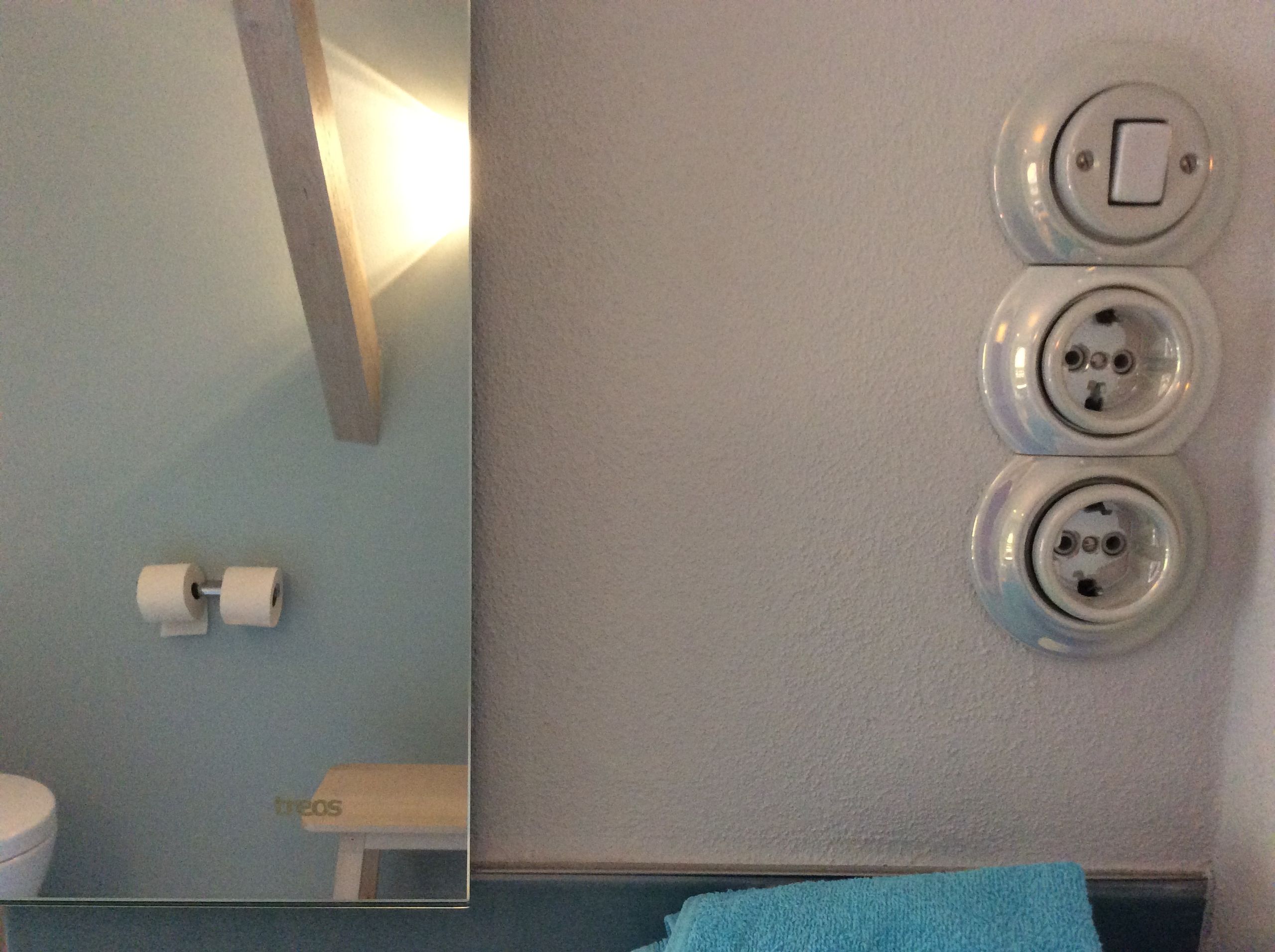 Nach der Dachsanierung darf ich mein drittes Apartment mit Balkon meinen Gästen anbieten. Anthrazitgraue Flur signalisiert: Hier wird es kuschelig! Es ist 88 qm groß: hochwertige Details wie Steckdosen aus Porzellan (Katy Paty, CZ Prag); Riemchen Fliesen in Farbe Eisblau, Italien, Wandleuchten Artemide, puk u.v.m.