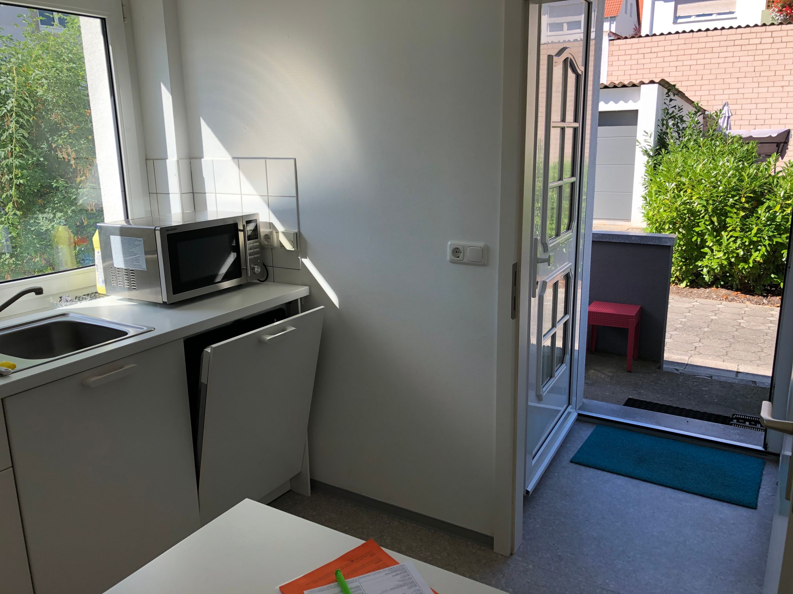 Im Jahr 2022 wurde das Dach mit neuester Technologie saniert & gedämmt. Geplant ist den Hof, links am Haus, zu erneuern. Aber Termin steht noch nicht fest. Fragen Sie mich, ich informiere Sie gerne. Da es sich um einen Altbau handelt, vor dem 2. Weltkrieg war das Gebäude eine jüdische Schule, gibt es hier und da kleine Stufen. Im Obergeschoss (Rote Etage) strahlt nun die neue Küche weiß im Kontrast zu einer Anthrazit-Wand.