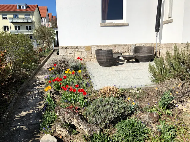 - Die Wohnung im Erdgeschoss hat direkten Zugang über den Balkon zum Vorgarten: Hier draußen können Sie im Schatten entspannt verweilen.
